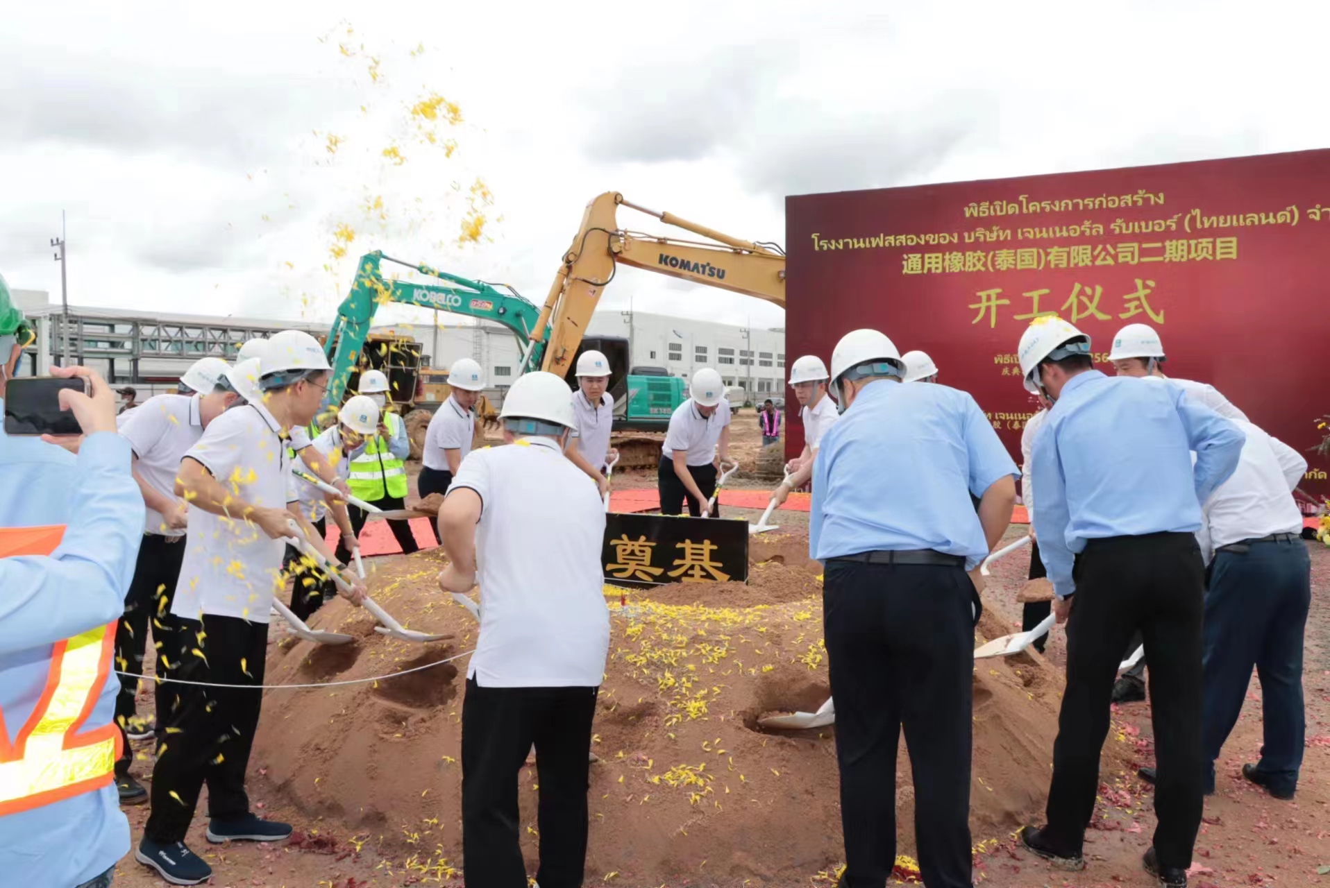 隨著各位領(lǐng)導(dǎo)共同完成“第一鏟土”,現(xiàn)場(chǎng)禮花滿天、禮炮齊鳴,奠基儀式圓滿落成,標(biāo)志著通用橡膠泰國(guó)公司二期項(xiàng)目正式起航。