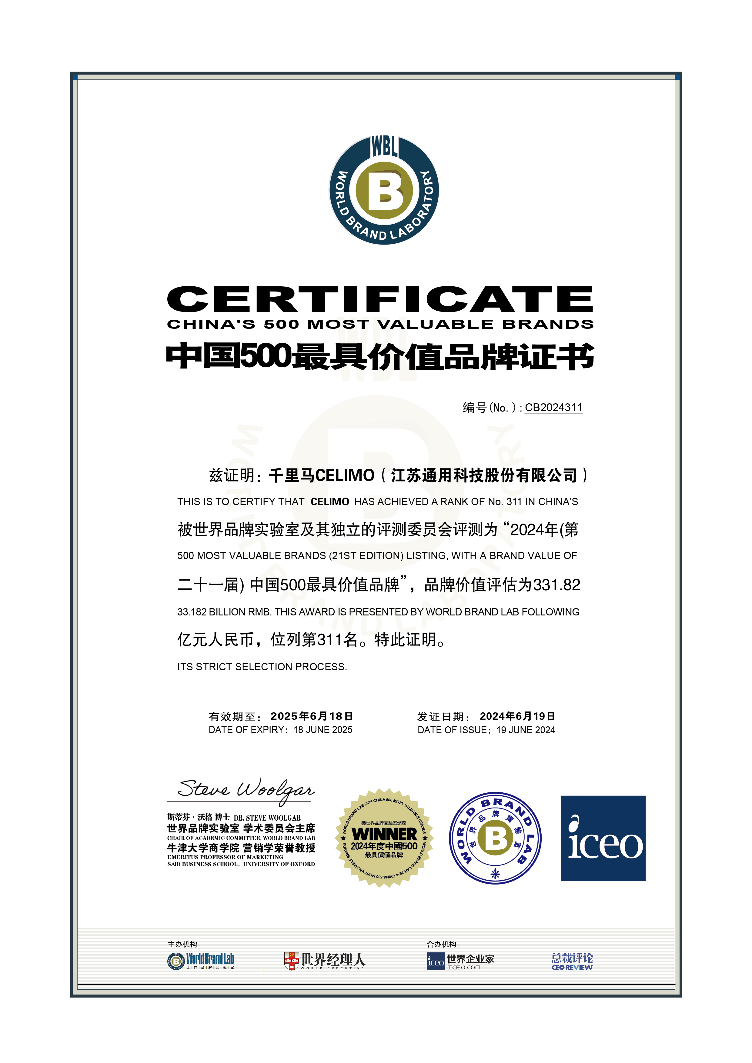 6月19日,世界品牌實(shí)驗(yàn)室(World Brand Lab)主辦的第二十一屆“世界品牌大會(huì)”在京圓滿落幕。會(huì)上隆重揭曉了2024年“中國(guó)500最具價(jià)值品牌”榜單,通用股份旗下千里馬CELIMO品牌憑借331.82億元人民幣的品牌價(jià)值,排名躍升至榜單第311位,連續(xù)六年獲此殊榮,彰顯了其強(qiáng)大的品牌實(shí)力。
